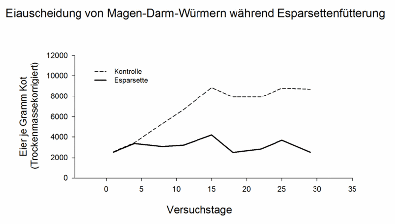Die in der Esparsette enthaltenen kondensierten Tannine erschweren den Magen-Darm-Würmern den Aufenthalt im Magen-Darm-Trakt ihres Wirtstieres. Dadurch können die weiblichen Würmer weniger Eier legen (Abbildung 1). Im genannten Beispiel wurde Esparsette in Form von Silo und Heu an Mutterschafe um die Zeit des Ablammens während 25 Tagen gefüttert. Während der Fütterung konnte die Eiausscheidung der Parasiten um ca. 50% reduziert werden. Allerdings stieg die Eiausscheidung nach Beendigung der Fütterung wieder an. Eine verringerte parasitäre Eiausscheidung während der Fütterung und ein Wiederanstieg danach ist ein häufig beobachtetes Phänomen.